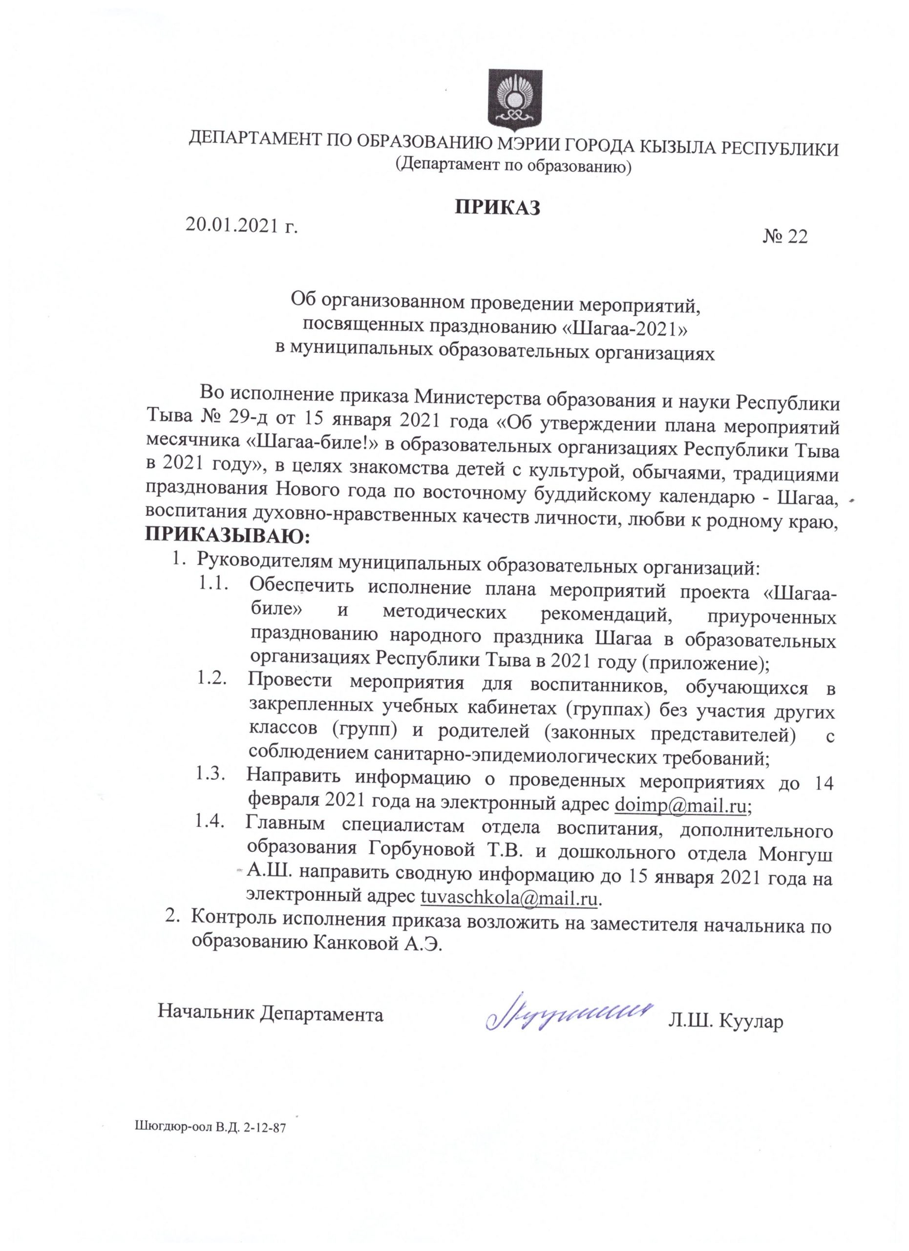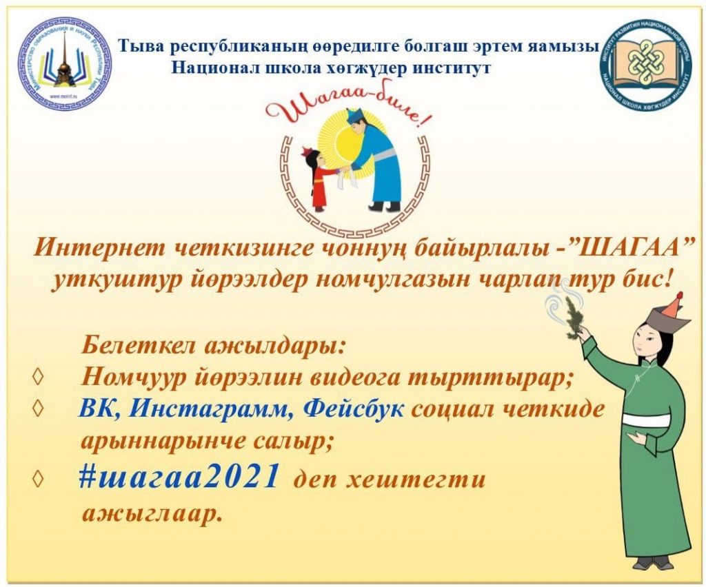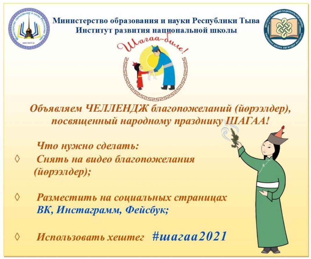 В целях знакомства детей с культурой, обычаями, традициями празднования Нового года по восточному, буддийскому календарю — Шагаа, воспитания духовно-нравственных качеств личности, любви к родному краю Министерством образования и науки утвержден план мероприятий месячника «Шагаа-биле». Во исполнение этого плана в лицее утвержден план мероприятий с 04 февраля по 12 февраля 2021 года.
