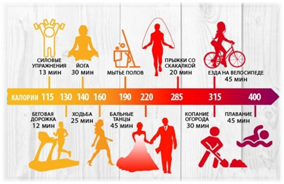5. Используя таблицу, рассчитайте, сколько калорий потратил Алдын-Херел на тренировке если он: пробежал на беговой дорожке 15 минут, выполнил прыжки через скакалку 10 минут и выполнил силовую тренировку с гантелями 20 минут.