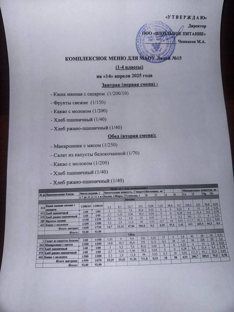 Меню на 14 апреля