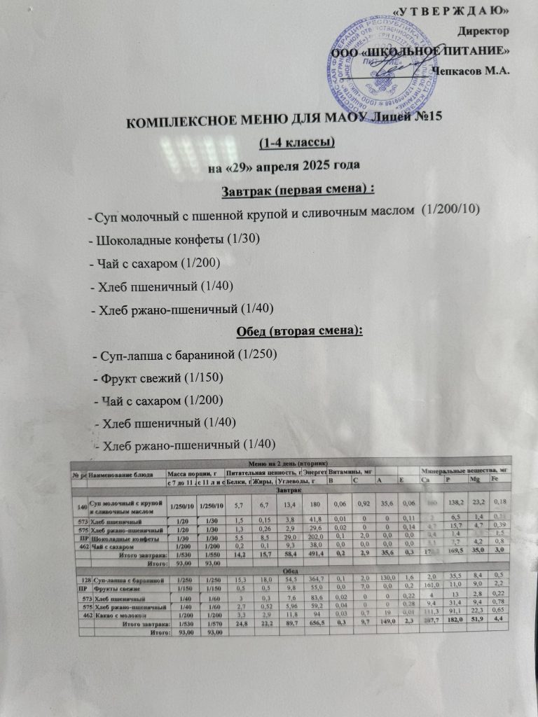 Меню на 29 апреля